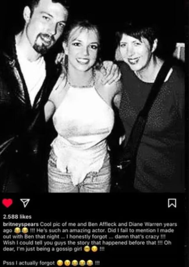 Spears afirmó en la publicación que se besó con Affleck esa noche, añadiendo que simplemente quería compartir el "chisme" con sus seguidores. Sin embargo, no proporcionó más detalles y posteriormente eliminó la foto. "¡Ojalá pudiera contarles la historia que pasó antes de eso!", agregó.