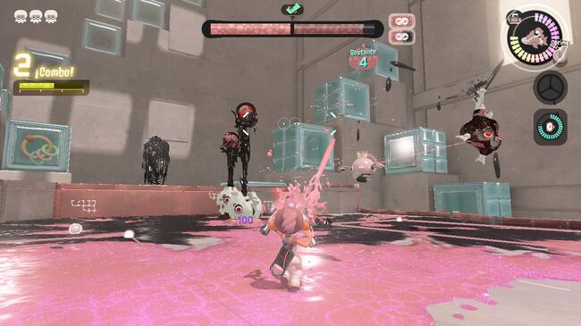 Adicional a que obedece al gameplay tradicional de Splatoon, tendremos a Perla ayudándonos en cada nivel en forma de dron, el cual también puede adquirir habilidades conforme vayamos subiendo como aturdir a los enemigos temporalmente, así que la combinación podrá variar entre cada oportunidad de afrontar los retos.