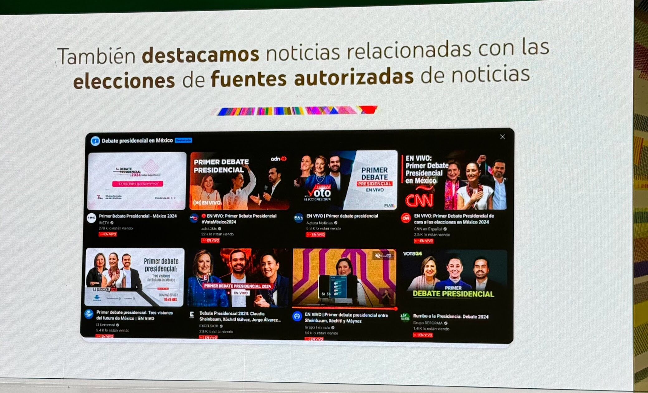 Esta es una experiencia de visualización que reúne contenido noticioso de fuentes diversas y autorizadas dentro de YouTube con el objetivo de permitir a los ciudadanos explorar, desde un mismo lugar, todo el contenido relacionado con noticias y acontecimientos específicos, a través de múltiples formatos como video resúmenes, transmisiones en vivo o Shorts. En temas relacionados con las elecciones de México 2024, se han acercado con el INE para asegurar que las fuentes autorizadas aparezcan de manera destacada en los resultados de búsqueda y en los paneles de "Ver a continuación". Esta función ya está disponible.