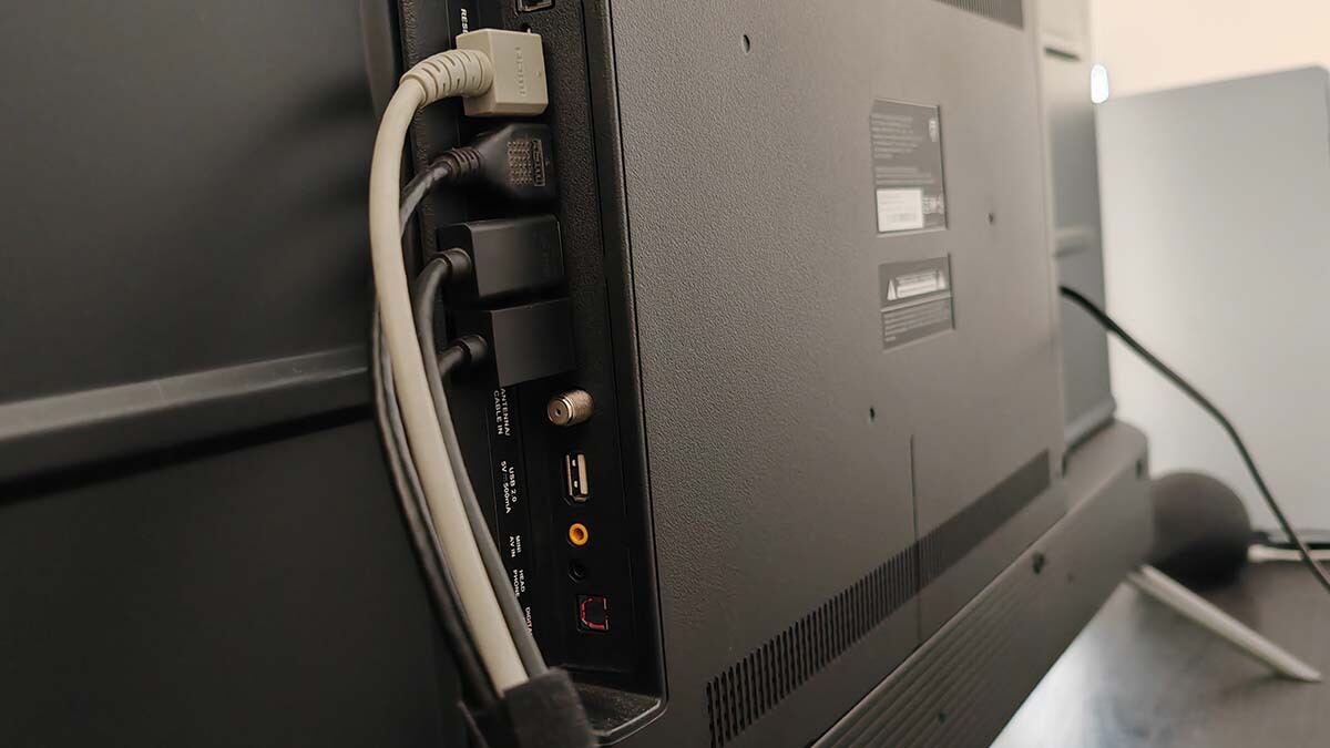 Encontramos una pantalla con un marco muy delgado, excepto en la parte inferior, donde se encuentra la marca de la compañía y el sensor del control remoto. En la base cuenta con dos sistemas de patas que ofrecen un buen soporte al televisor, mientras que en la parte trasera encontramos un sistema que permite colocar los cables de forma sencilla, ya sea la televisión apoyada en un mueble o colgada. Dentro de este apartado, siempre es una alegría contar con cuatro puertos HDMI, aunque desafortunadamente, ninguno de estos es HDMI 2.1. Fuera de eso, cuenta con todas las entradas que uno esperaría utilizar en un televisor.