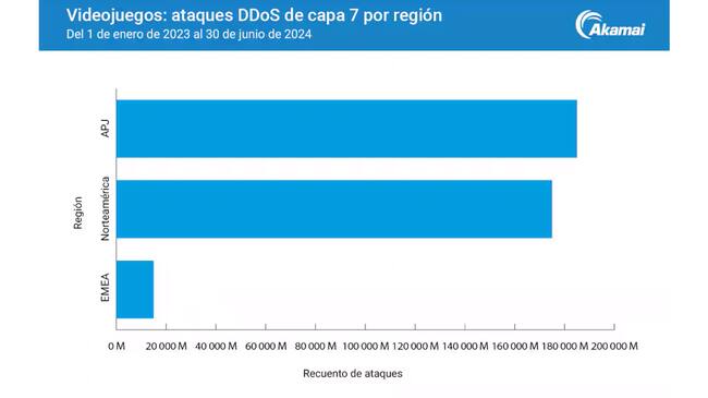 Ataques DDoS: Los ataques de denegación de servicio distribuido (DDoS) de Capa 7 han experimentado un aumento del 94% con respecto al año anterior. En algunos meses se han registrado más de 25.000 millones de ataques de este tipo, con la región de Asia-Pacífico y Japón (APJ) a la cabeza de las estadísticas, a su vez, América del Norte, otro gigante del sector, le sigue de cerca con más de 170 mil millones de ocurrencias registradas en el período analizado por Akamai, que va de enero de 2023 a junio de 2024.