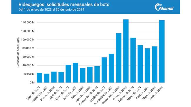 El auge de los bots. Las solicitudes de bots han alcanzado cifras récord, con 147.000 millones de solicitudes sólo en enero de 2024. Este fenómeno plantea nuevos retos para la seguridad de los juegos en línea.