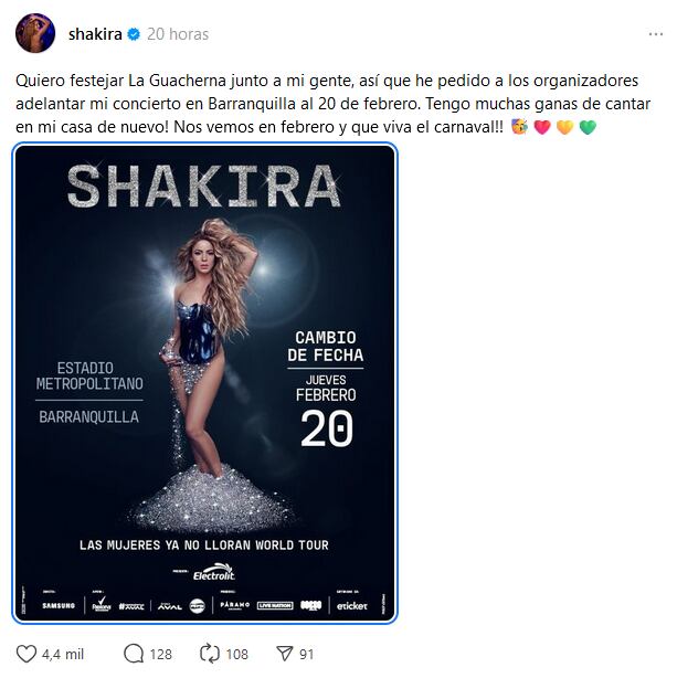 Sin embargo, la cantante anunció este 4 de octubre, que adelantaría su concierto para el 20 de febrero. “Quiero festejar La Guacherna junto a mi gente, así que he pedido a los organizadores adelantar mi concierto en Barranquilla al 20 de febrero.