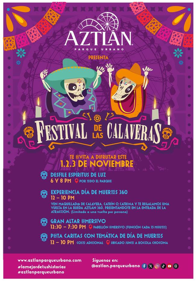 Todas las personas que lleguen maquilladas como calavera, catrín o catrina este 1, 2 y 3 de noviembre al parque Aztlán Parque Urbano, podrán subirse de manera gratuita a la Rueda Aztlán 360, la más alta de México.