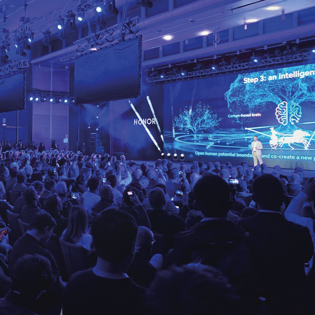 El teléfono inteligente previsto, que es fundamental para el primer paso, incorporará IA centrada en el ser humano y diseñada específicamente para maximizar su potencial, incluida la tecnología de IA líder de HONOR presentada durante el discurso de apertura.