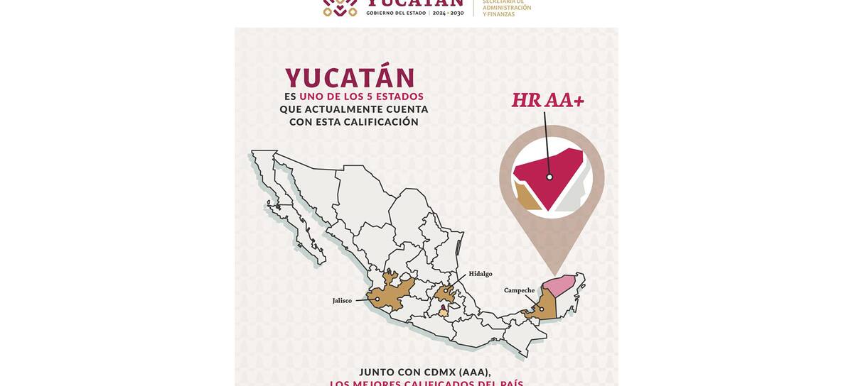 Yucatán alcanza la calificación HR AA+ y se posiciona entre las entidades federativas con mayor solidez financiera vigente en el país, de acuerdo con HR Ratings. “Solo cinco estados comparten actualmente este nivel de confianza crediticia. Este reconocimiento reafirma el liderazgo financiero de Yucatán y proyecta al estado como un referente nacional en responsabilidad, estabilidad y visión de futuro”, puntualiza.