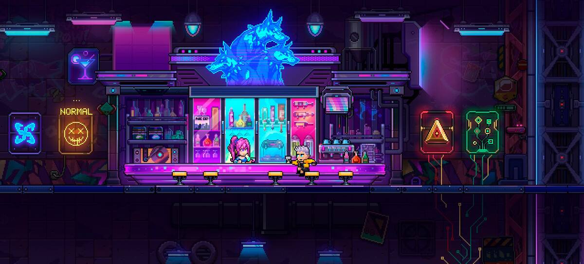 Nuestro personaje aparecerá en un bar conectado al abismo, un lugar lleno de tesoros por recoger, monstruos por eliminar y jefes de nivel que nos darán recompensas muy jugosas. Así que como se platicó al inicio de este texto, Neon Abyss 2 utiliza la fórmula roguelite, por lo que tan solo apareceremos con un arma básica que podremos cambiar por algunas más avanzadas en el camino.