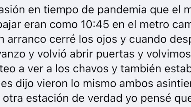 Sin saber cómo, terminó saliendo por una puerta oxidada, sin señalización, que lo dejó en un andén ¡por fin! Pero, cuando volteó a su alrededor, estaba en Colegio Militar. “¿Cómo llegué ahí? No tenía ni pies ni cabeza”, expresó.