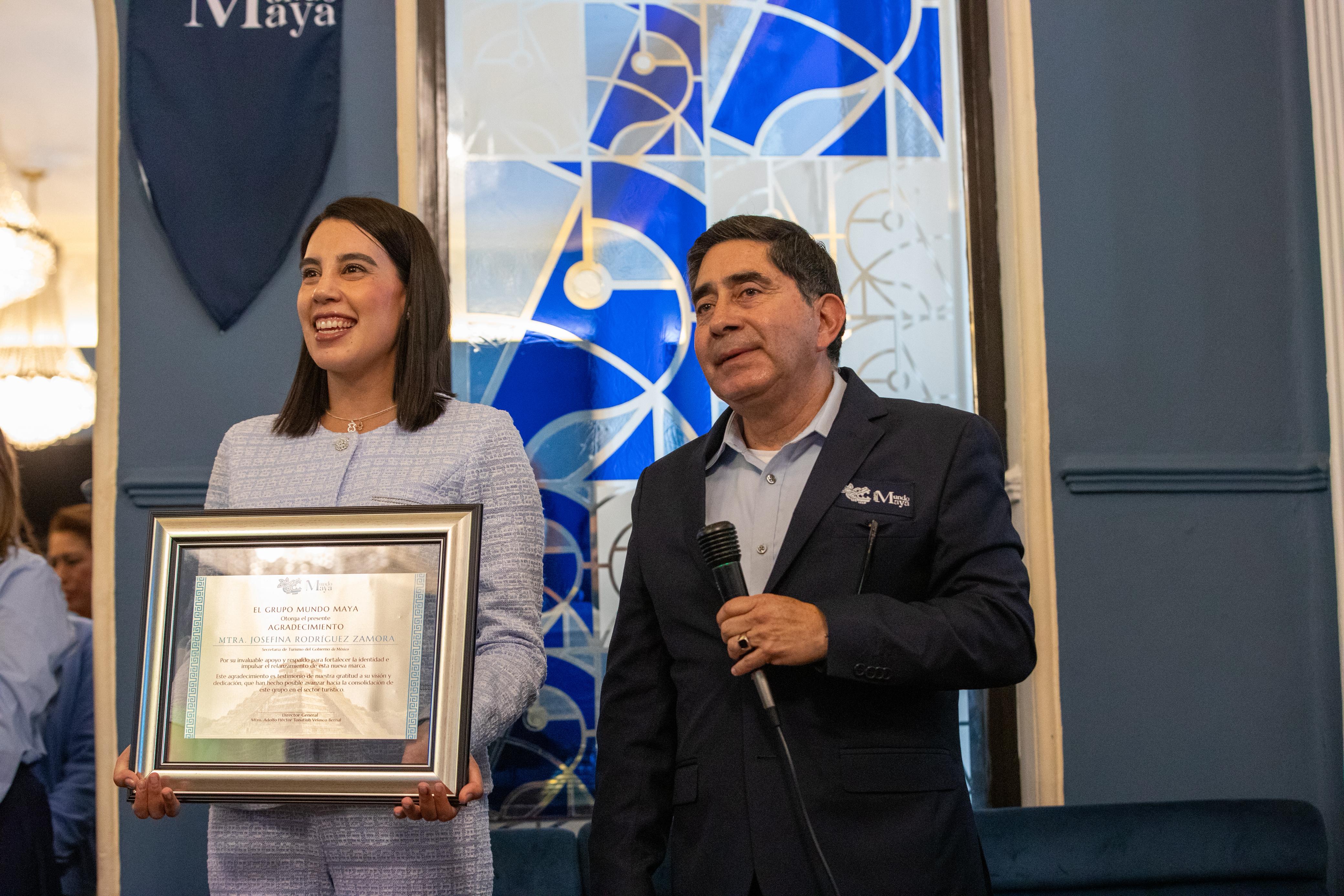 En este mismo contexto de fortalecimiento turístico, la secretaria Josefina Rodríguez Zamora encabezó también el relanzamiento de la marca Grupo Mundo Maya, acompañada por el director general del Grupo Mundo Maya, Adolfo Héctor Tonatiuh Velasco Bernal, así como representantes del sector turístico, medios de comunicación e invitados especiales.