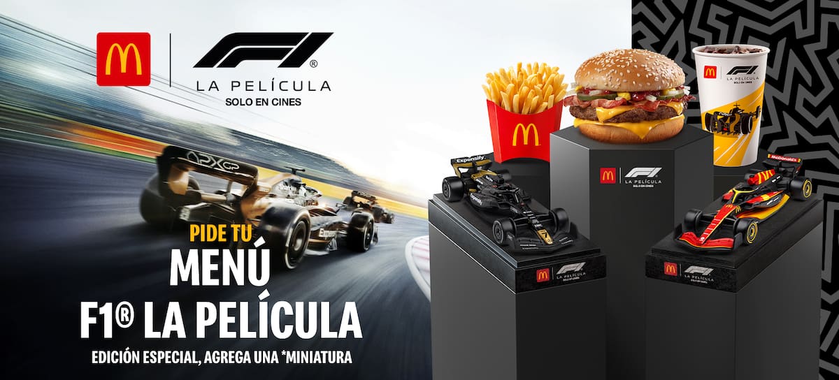 A partir de este 24 de junio, corre a tu McDonald's favorito y pide tu Menú F1 La Película. ¿Qué incluye esta joya? Un delicioso Cuarto de Libra con queso y tocino, unas papitas crujientes y un refresco bien frío. ¡Pero eso no es todo! Lo mejor es que, al comprar tu Menú, puedes agregar uno de los dos autos miniatura con diseños exclusivos de McDonald’s y F1 La Película.