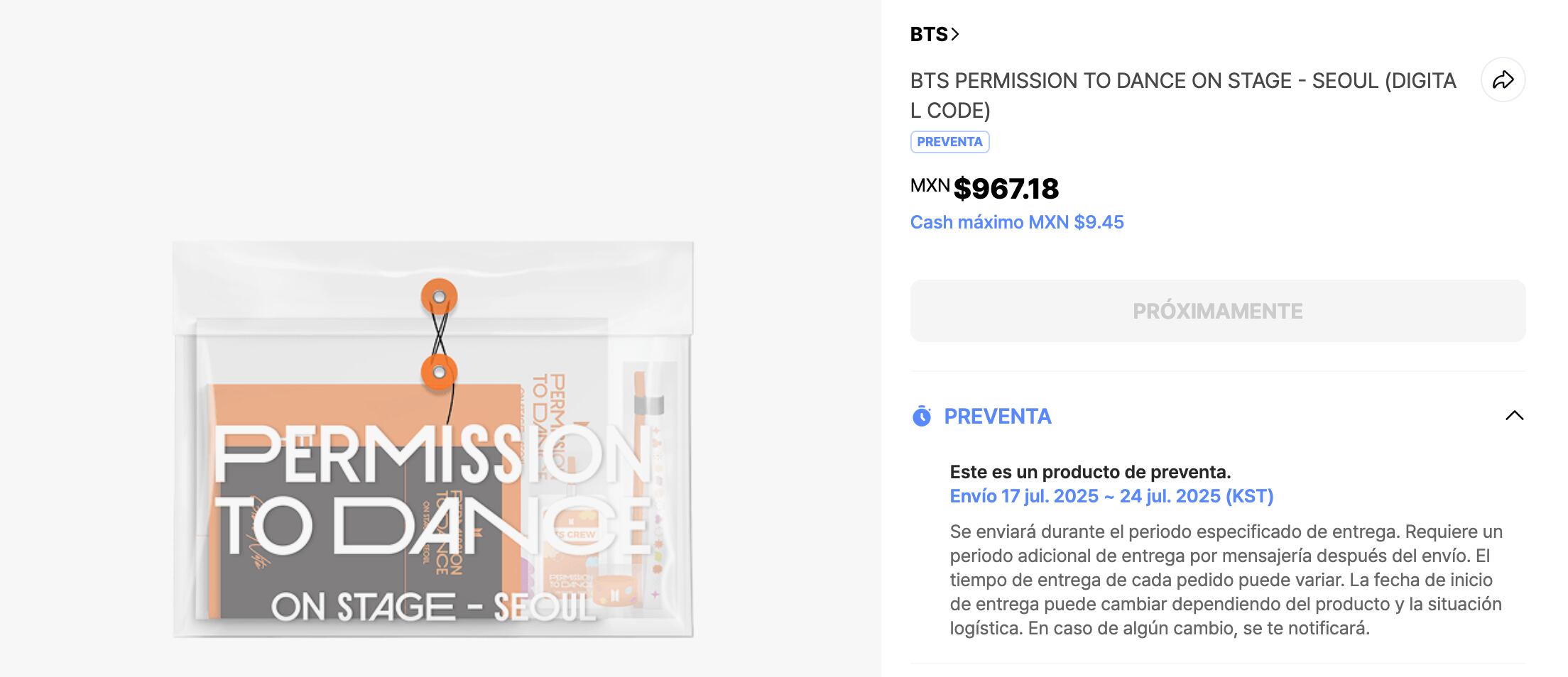 La preventa estará disponible a partir del 1 de julio a través de la plataforma de Weverse Shop y tendrá un costo de $967 pesos mexicanos.