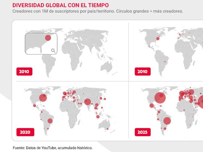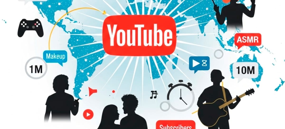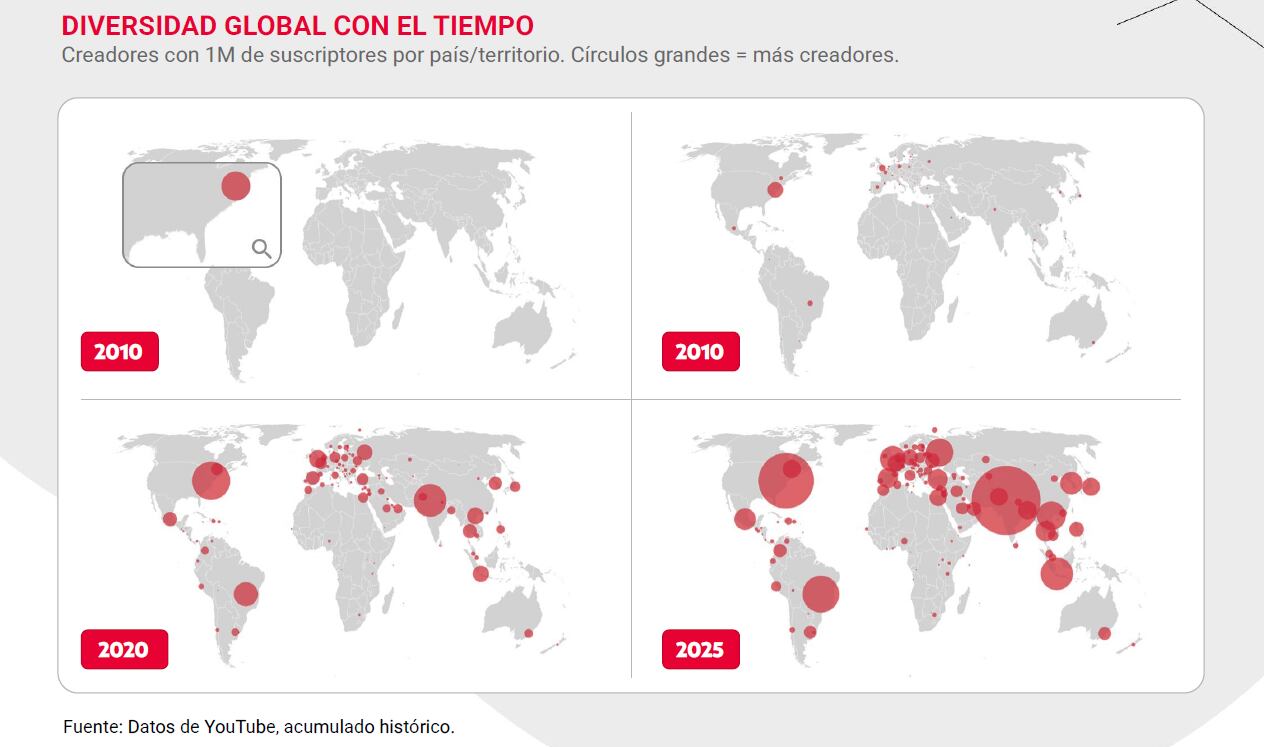 Desde un garaje en California, YouTube se expandió rápidamente, operando hoy en más de 100 países y 80 idiomas. Esta expansión global fomentó una diversidad mediática inigualable, permitiendo que talentos de todas partes del mundo se conectaran con audiencias. Creadores como Fred (primer canal en alcanzar 1 millón de suscriptores en 2009), Werever2morro, Yuya, y el chileno HolaSoyGerman (primer youtuber hispanohablante en Latinoamérica en alcanzar 10 millones en 2013), son ejemplos del rápido crecimiento y el impacto global de la plataforma.