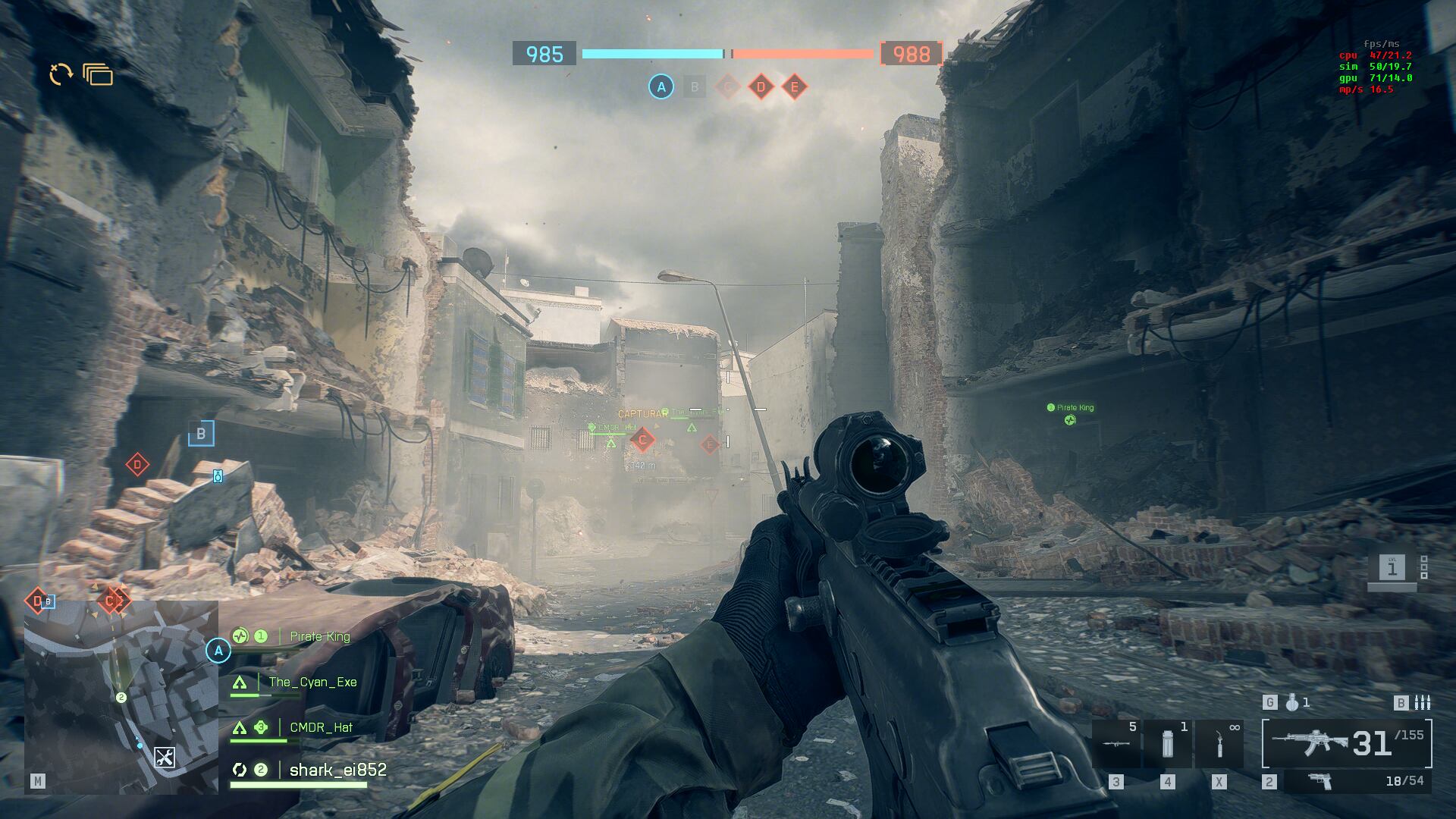 En las primeras partidas que jugamos nos dimos cuenta que es importante la comunicación del equipo, así como la correcta coordinación de los miembros de cada escuadra, conformada por 4 miembros cada 1. Al menos en las primeras salas que el emparejamiento nos ofreció, pudimos acceder de manera constante al modo Conquista, como su nombre lo dice, es la captura de 5 puntos estratégicos en el mapa. Ante el mayor tiempo controlando 3 sobre 2 al enemigo, se recuperarán las reapariciones del jugador, el ejército con 0 miembros activos pierde.