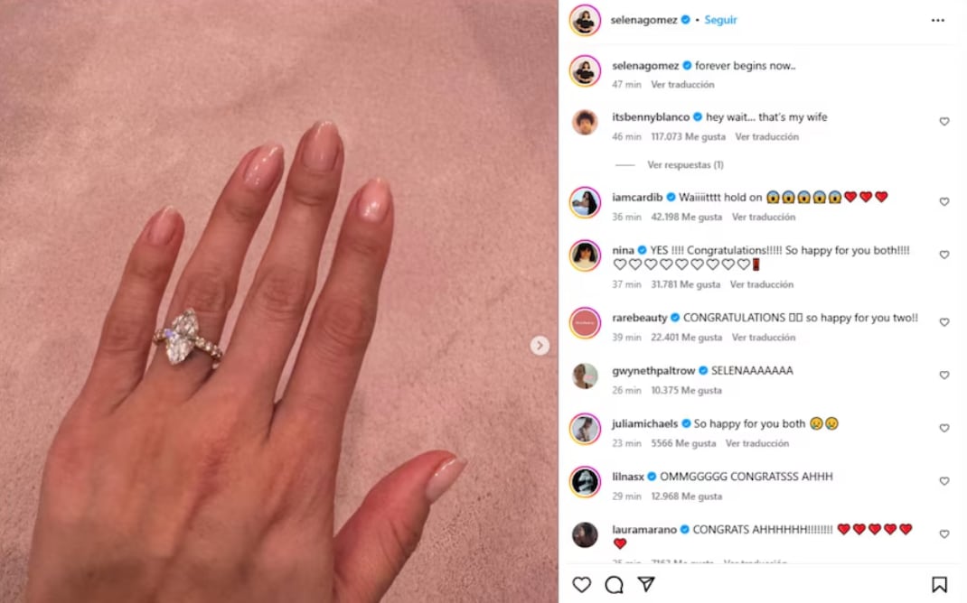 Según lo que ellos han dicho, la propuesta fue durante un picnic romántico. Selena lo anunció a través de una publicación en Instagram con la foto de su anillo y la frase: “el por siempre empieza ahora…”.