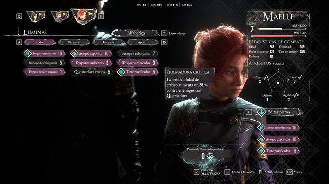 Y si bien no existen “items” a equipar como armaduras, cascos o brazaletes al estilo otros RPG, en Clair Obscur: Expedition 33 hay dos cosas muy importantes que completan al personaje, el arma que están usando que además del nivel de daño, algunas de ellas tienen ciertos elementos fijos (como fuego o hielo) y el más importante algo llamado Pictos, que son piezas que dan atributos especiales a cada personaje, puede ser la resistencia a un ataque, más puntos de acción al hacer algo o ganar buffs durante el combate. Lo interesante de los pictos es que además de que añaden mejoras directas al personaje como más energía, mejor defensa o más velocidad, una vez que cierto personaje los “aprende” la habilidad de ese picto está disponible para que otro personaje del Party pueda utilizar a cambio de algo llamado puntos Lumina. Aunque complejo, el sistema es bastante sencillo, pero lo suficientemente flexible para tener un party balanceada y por ende mejor preparada para los combates más complejos y difíciles.