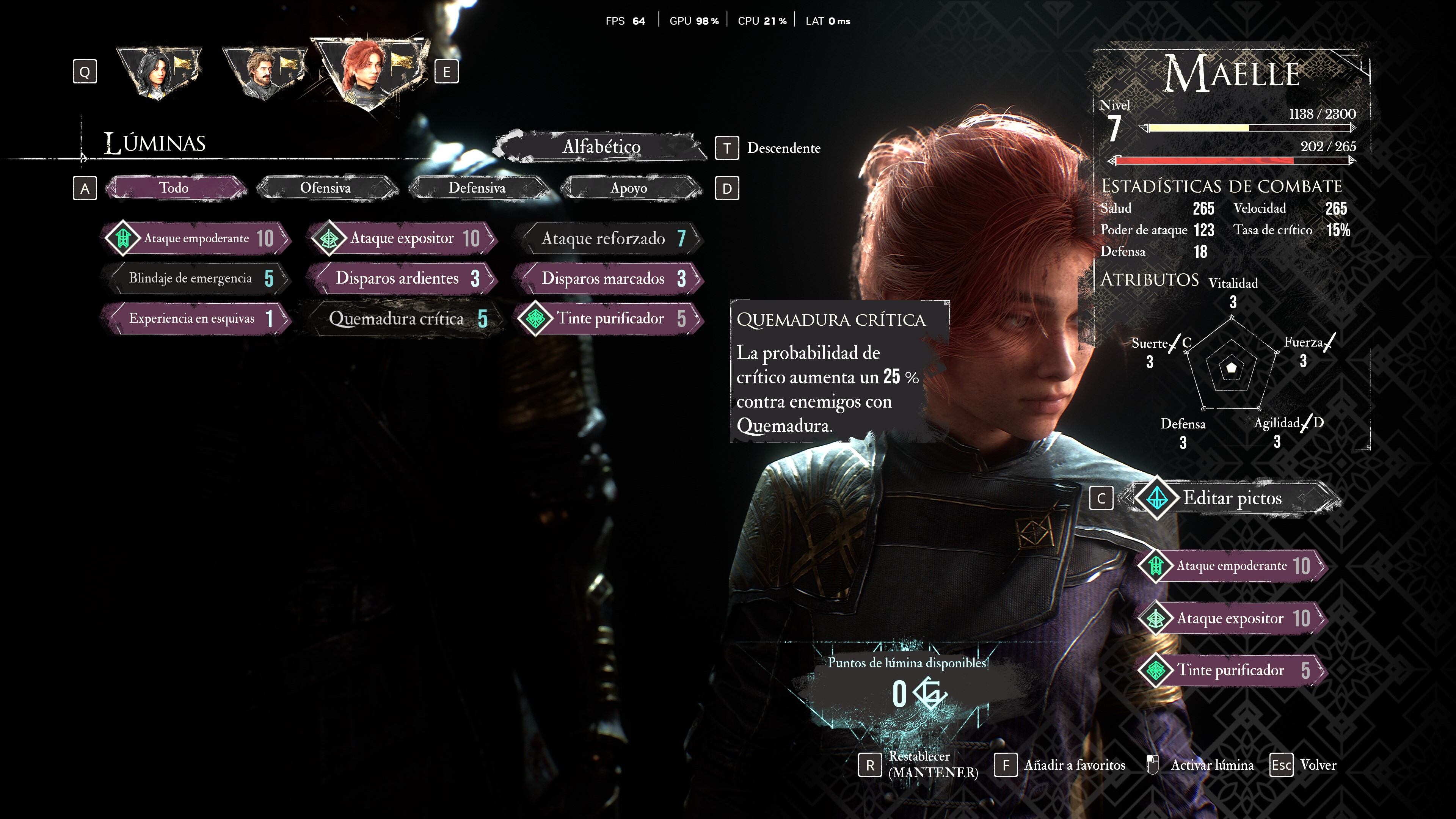 Y si bien no existen “items” a equipar como armaduras, cascos o brazaletes al estilo otros RPG, en Clair Obscur: Expedition 33 hay dos cosas muy importantes que completan al personaje, el arma que están usando que además del nivel de daño, algunas de ellas tienen ciertos elementos fijos (como fuego o hielo) y el más importante algo llamado Pictos, que son piezas que dan atributos especiales a cada personaje, puede ser la resistencia a un ataque, más puntos de acción al hacer algo o ganar buffs durante el combate. Lo interesante de los pictos es que además de que añaden mejoras directas al personaje como más energía, mejor defensa o más velocidad, una vez que cierto personaje los “aprende” la habilidad de ese picto está disponible para que otro personaje del Party pueda utilizar a cambio de algo llamado puntos Lumina. Aunque complejo, el sistema es bastante sencillo, pero lo suficientemente flexible para tener un party balanceada y por ende mejor preparada para los combates más complejos y difíciles.