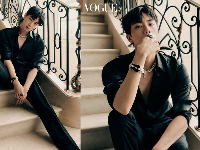 En esta edición de Vogue Korea, Jin luce un look completamente negro, de los pies a la cabeza, acentuando los accesorios y la elegancia de su persona. Probando que aveces menos es mas y que el negro nunca pasara de moda.