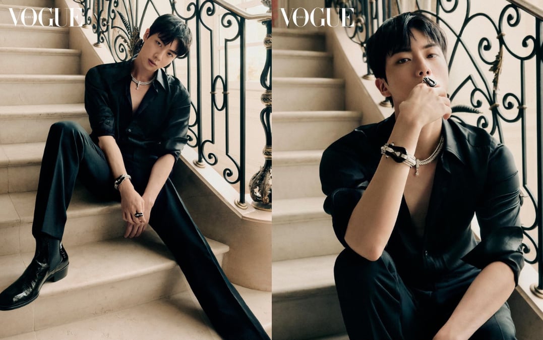 En esta edición de Vogue Korea, Jin luce un look completamente negro, de los pies a la cabeza, acentuando los accesorios y la elegancia de su persona. Probando que aveces menos es mas y que el negro nunca pasara de moda.