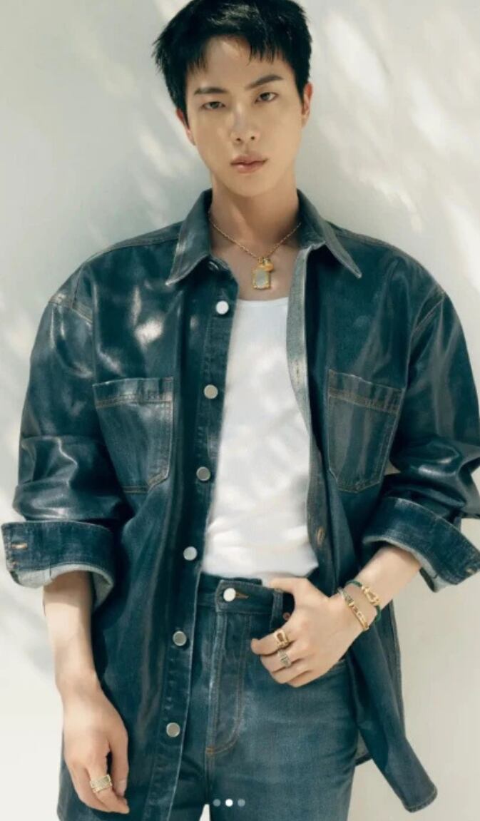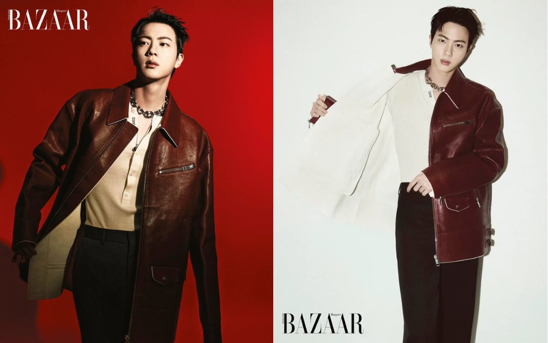 En la edición de septiembre de Harper’s Bazar de 2024, Jin lució un pantalón de vestir oscuro, una camiseta de botones blanca y el toque maestro, una gabardina de piel guinda , que elevo su look juvenil y moderno a uno más sofisticado pero sin llegar a verse presuntuoso. El toque de los cierres en la gabardina y los accesorios metálicos le dieron un toque de estrella pop.