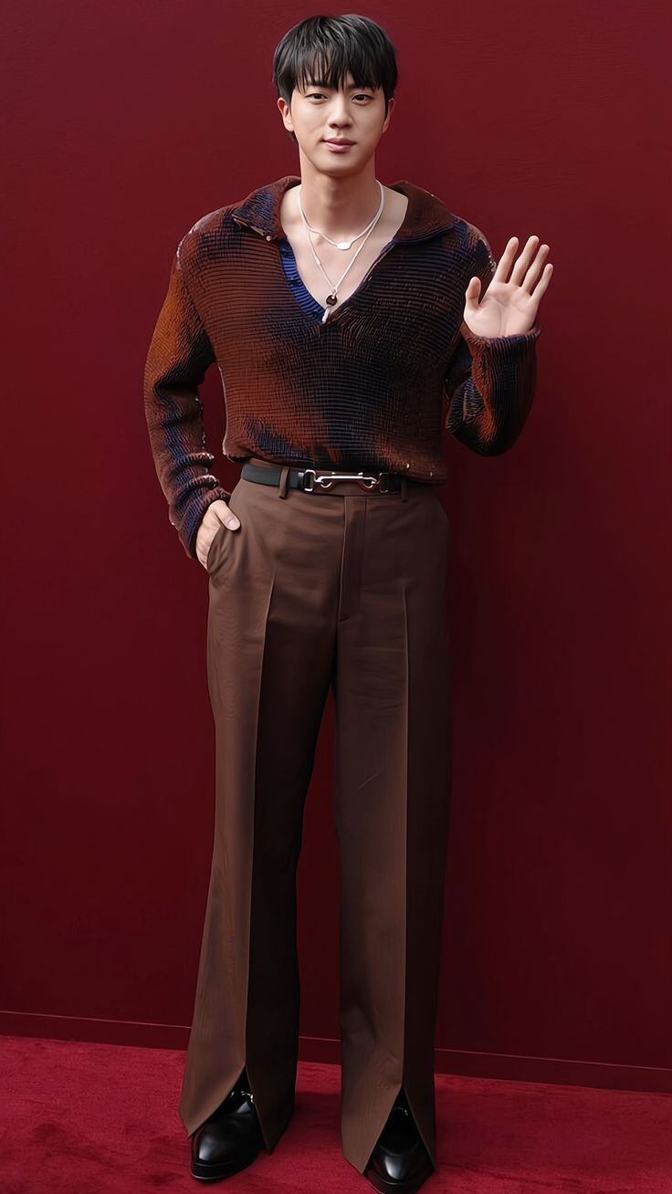 En la Semana de la Moda de Milán en 2024, Kim Seokjin vistió unos pantalones acampanados en color marrón y una camiseta de tonos similares con estampados en vino y azul, manteniendo la estética retro pero con un toque moderno y elegante.