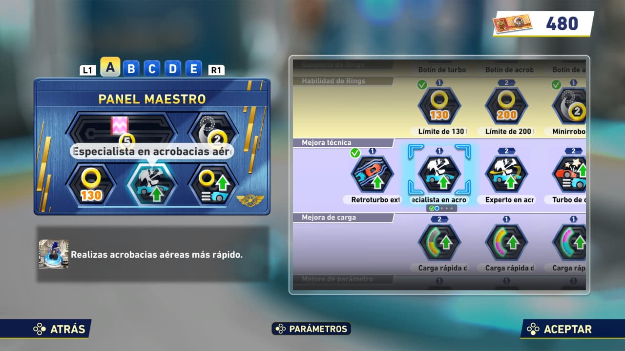 Pero eso no es todo, ya que además hay una placa en la cual puedes colocar diferentes poderes o ventajas para darte un empujón en las carreras. Aquí es donde cada uno termina de amarrar su “build” y se abren aún más las posibilidades de personalizar tu corredor. Cosas como poder robar anillos al chocar, tener un boost ligero a tu velocidad máxima, poder girar para dar golpes a tus rivales o poder cambiar el orden de tus items. Hay muchísimas opciones, cada una ocupando diferentes espacios en tu placa, lo que te da un límite a cuántos puedes utilizar. Podrías usar un poder que ocupa tres espacios, uno de dos y uno de uno para así llenar los seis disponibles, solo usar seis poderes más chiquitos de un espacio cada uno, todo depende de cómo quieras correr y mientras más corres más poderes tendrás, lo que me lleva al siguiente punto.