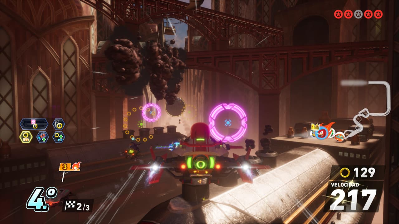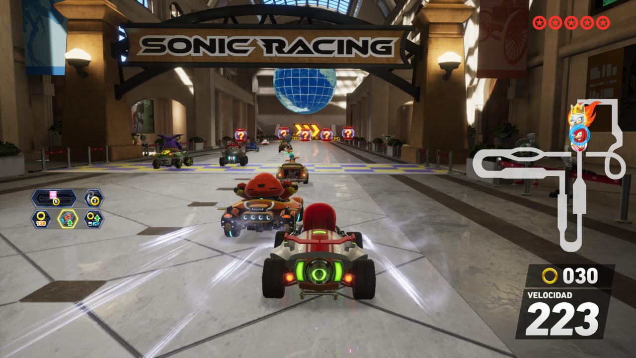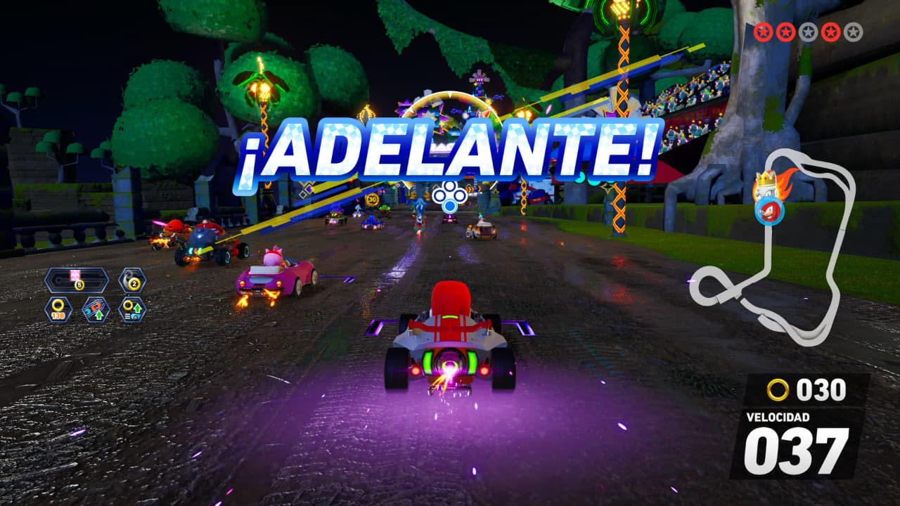 Las carreras en sí se sienten bien, sobre todo en dificultades más altas en donde esa diferencia de velocidad es aparente. Se ve que las pistas se diseñaron con cierta velocidad en adelante en mente y derrapar por todas las curvas mientras acumulas boost es una parte fundamental del juego. Hay un énfasis en correr, y correr bien ya que, aunque sí hay ítems y si afectan la carrera, el ritmo y cantidad que te dan es mucho más reducido, haciendo que su uso sea en puntos cruciales más que solo lanzar todo lo que te venga a las manos en cuanto aparece. Eso hace que te concentres más en agarrar curvas de forma correcta y recolectes anillos, que invariablemente tendrán un efecto mayor en tu desempeño que solo usar los ítems. Hasta chocar contra una pared es penalizado quitándote anillos.
