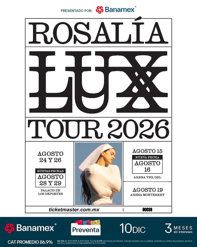 Si quieres conocer los precios y qué incluyen sus paquetes V.I.P., te dejamos la info en otra nota: Rosalía en México 2026: Estos son los precios de todos los boletos del LUX Tour