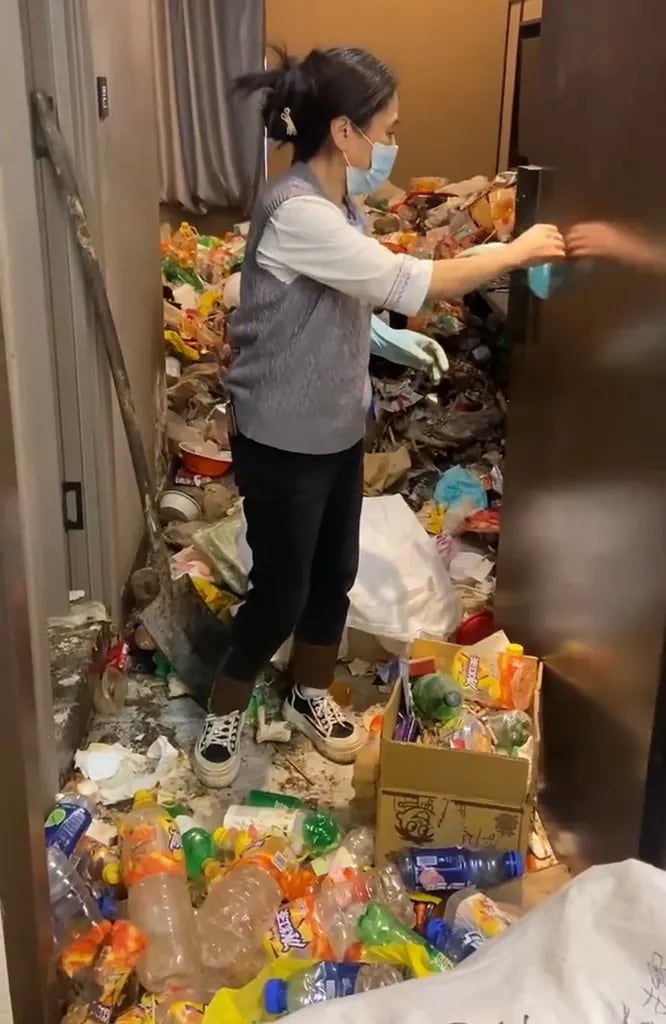 Un equipo de limpieza expone la falta de civismo de un huésped que dejó su cuarto cubierto de basura y restos de comida