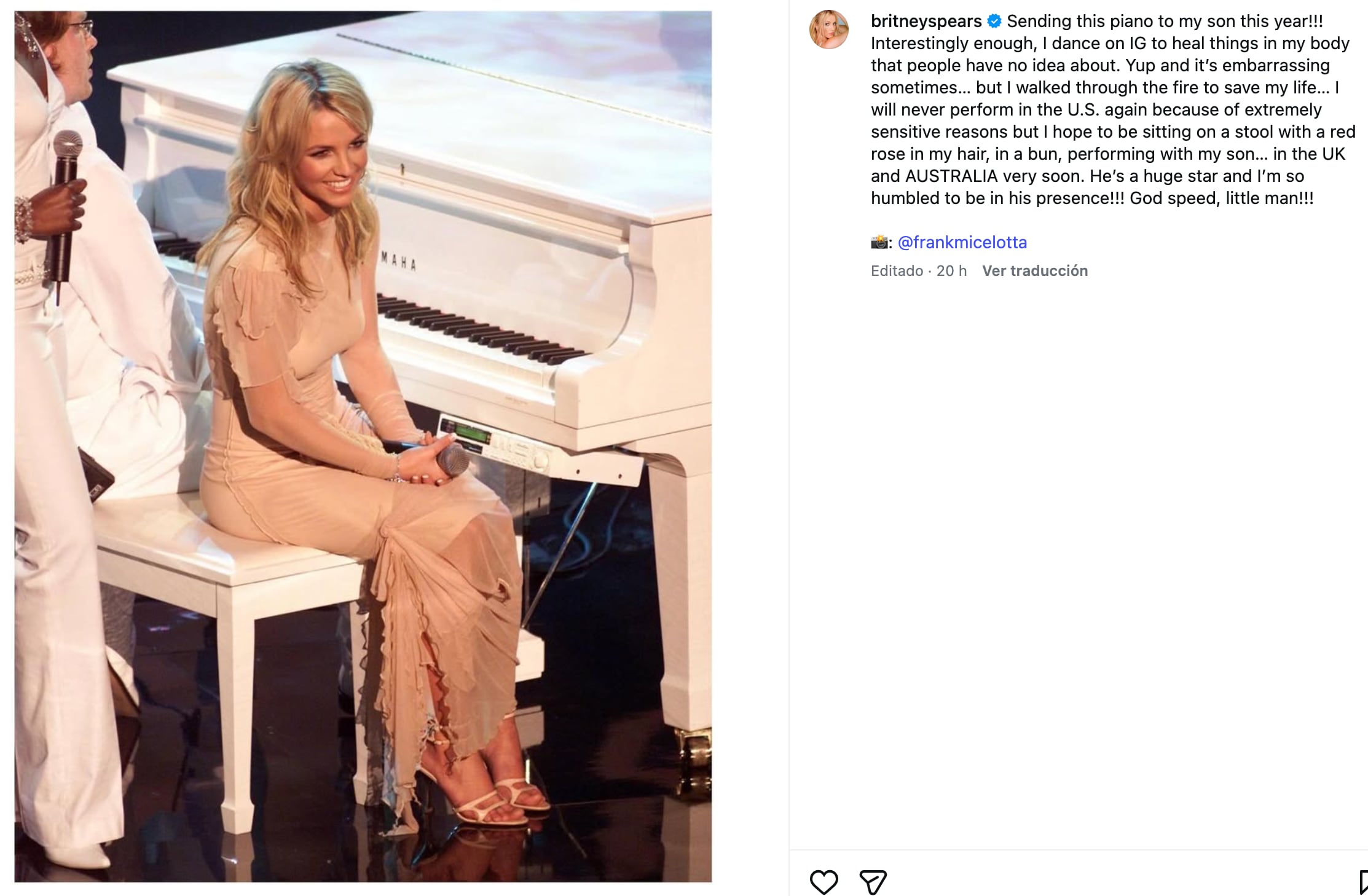 “Espero estar sentada en un taburete con una rosa roja en mi cabello, atada a un moño, presentándome junto a mi hijo… en el Reino Unido y Australia muy pronto. Él es una gran estrella y estoy honrada de estar en su presencia”, comentó Britney en su publicación.