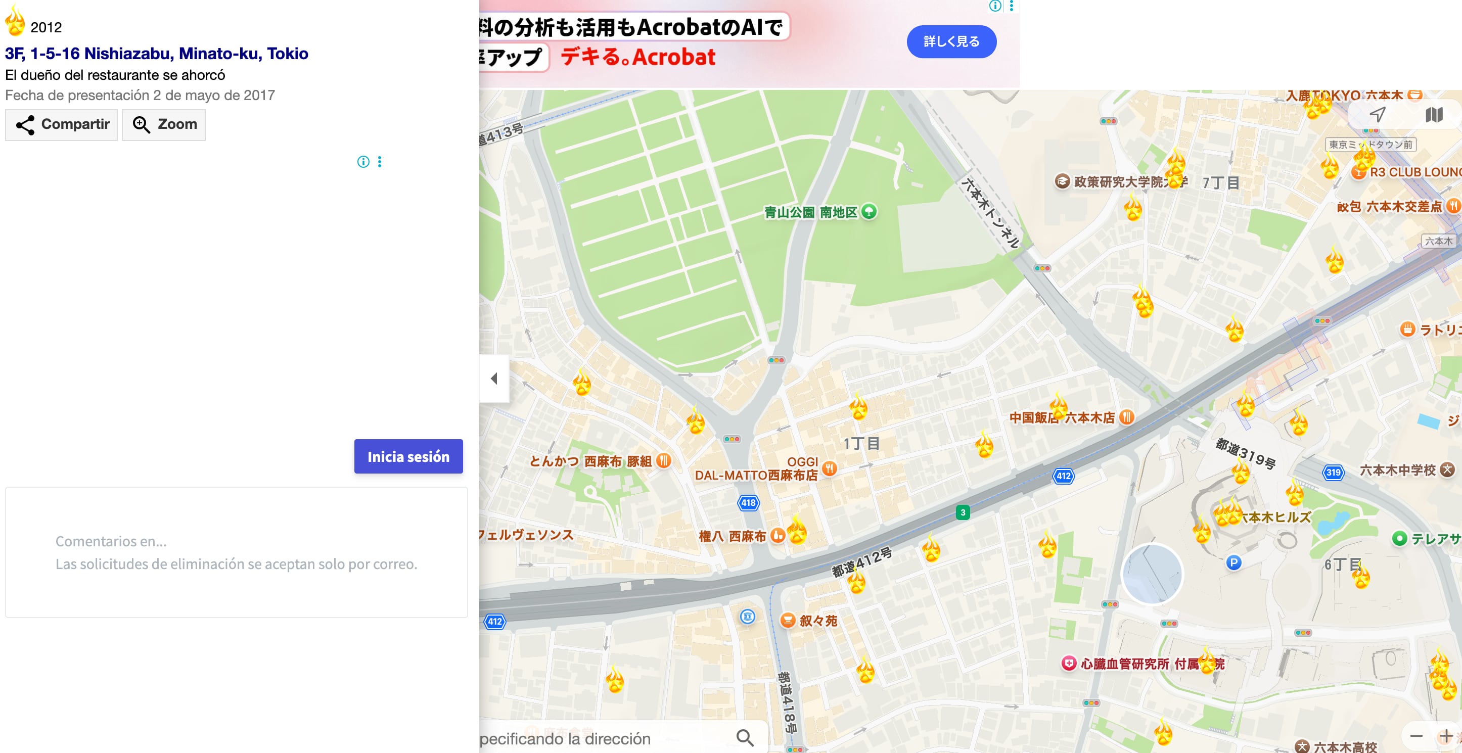 Esta plataforma colaborativa utiliza la interfaz de Google Maps para marcar con iconos de fuego cada ubicación donde ha sucedido un evento trágico, indicando, en algunos casos que fue lo que sucedió. A diferencia de un sitio de noticias amarillista, este portal se enfoca en la utilidad práctica. Esto representa una ventaja de transparencia invaluable: permite conocer el historial real de un inmueble antes de firmar un contrato, evitando sorpresas desagradables relacionadas con las profundas supersticiones japonesas sobre la muerte y la "mala suerte".