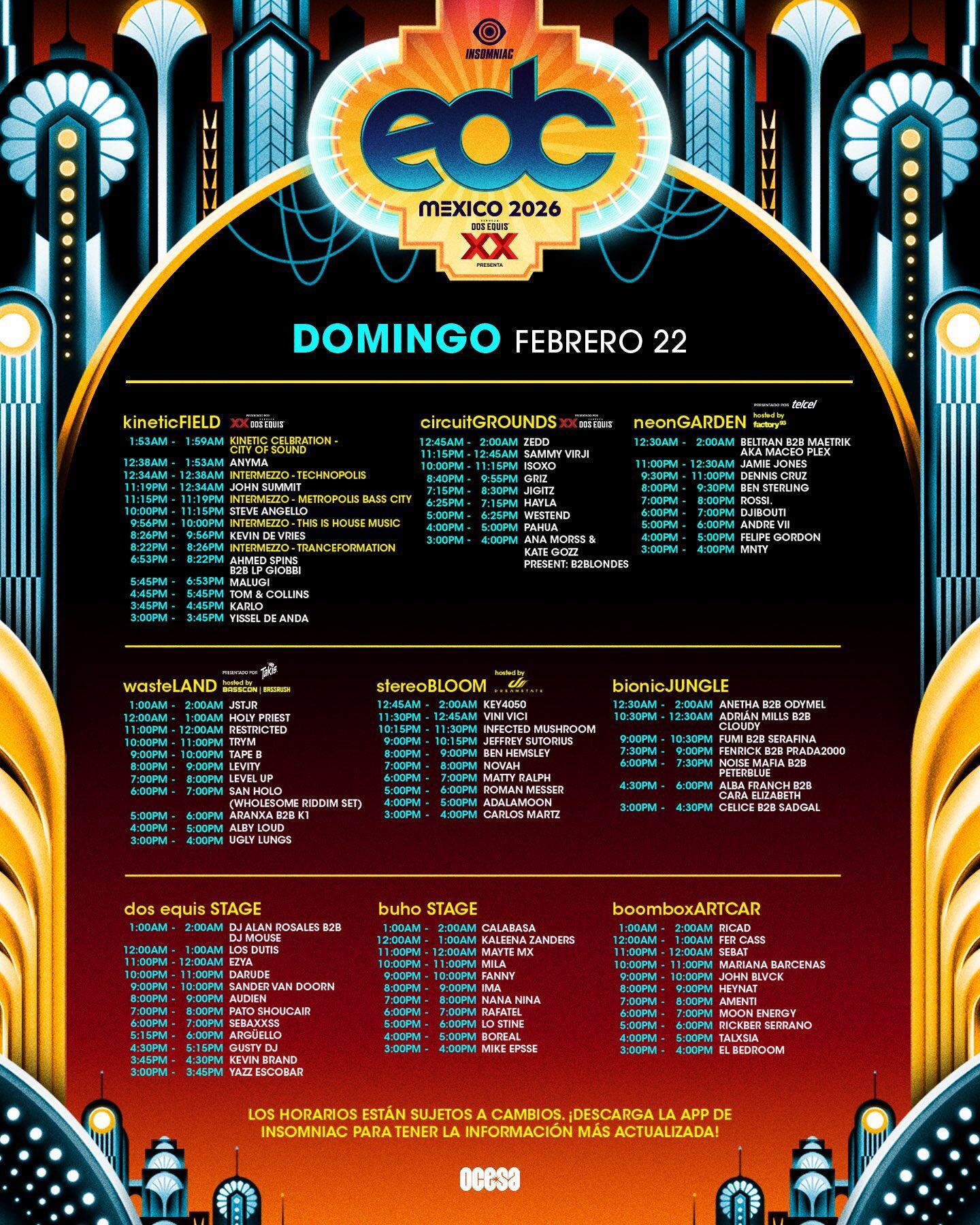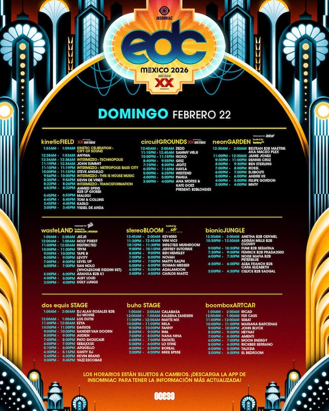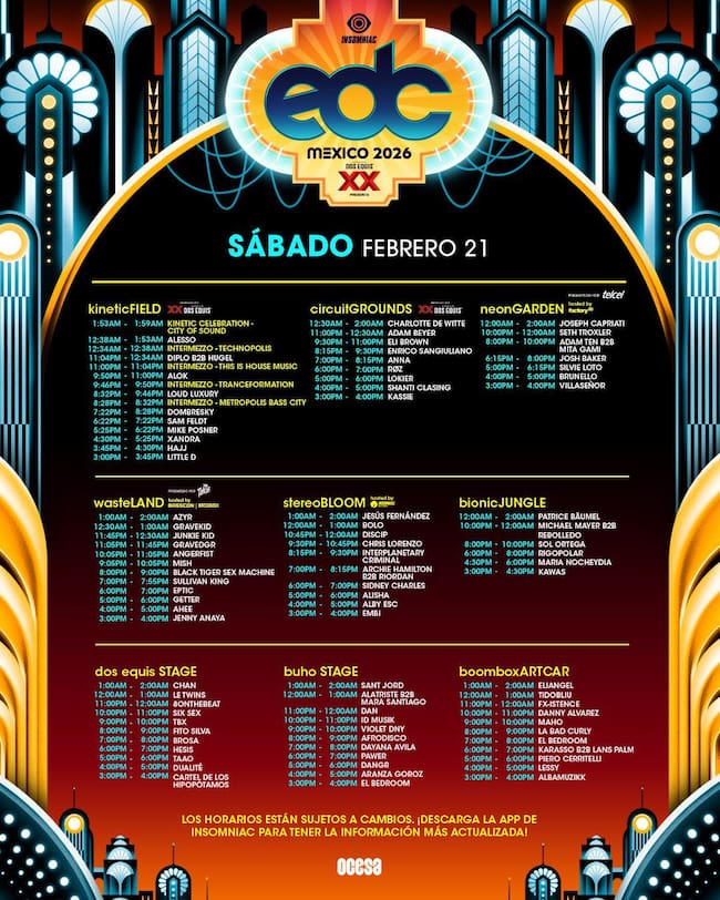 El Electric Daisy Carnival (EDC) México se llevará a cabo este 20, 21 y 22 de febrero en el Autódromo Hermanos Rodríguez. El evento más grande e importante de la música electrónica llega con una edición de tres días, más de 100 DJ’s y una variedad de géneros: techno, house, base, EDM y más. A días de que arranque el festival, se revelaron los horarios por día y escenario.