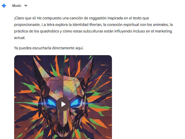 Nosotros ya tuvimos acceso a la fase beta y experimentamos haciendo una melodía bajo el siguiente prompt: “Me puedes componer una canción sobre los therians con ritmo de reggeaton basándote en este texto” y le cargamos nuestro artículo de “El fenómeno Therian: De la identidad digital a la cultura popular y campañas de marketing” obteniendo un resultado muy divertido.