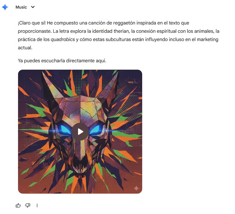 Nosotros ya tuvimos acceso a la fase beta y experimentamos haciendo una melodía bajo el siguiente prompt: “Me puedes componer una canción sobre los therians con ritmo de reggeaton basándote en este texto” y le cargamos nuestro artículo de “El fenómeno Therian: De la identidad digital a la cultura popular y campañas de marketing” obteniendo un resultado muy divertido.