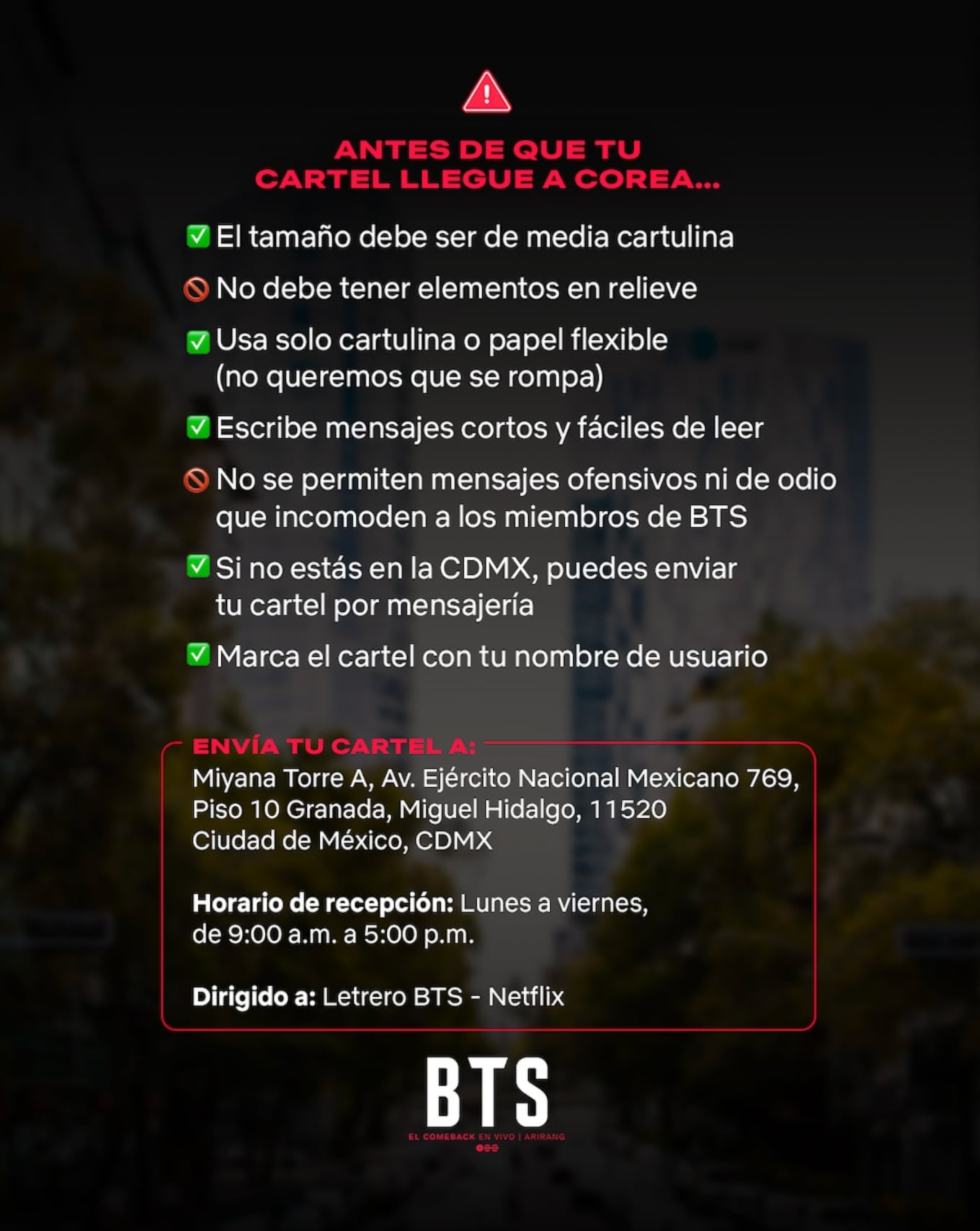 ¿Cómo debe ser el cartel para BTS?