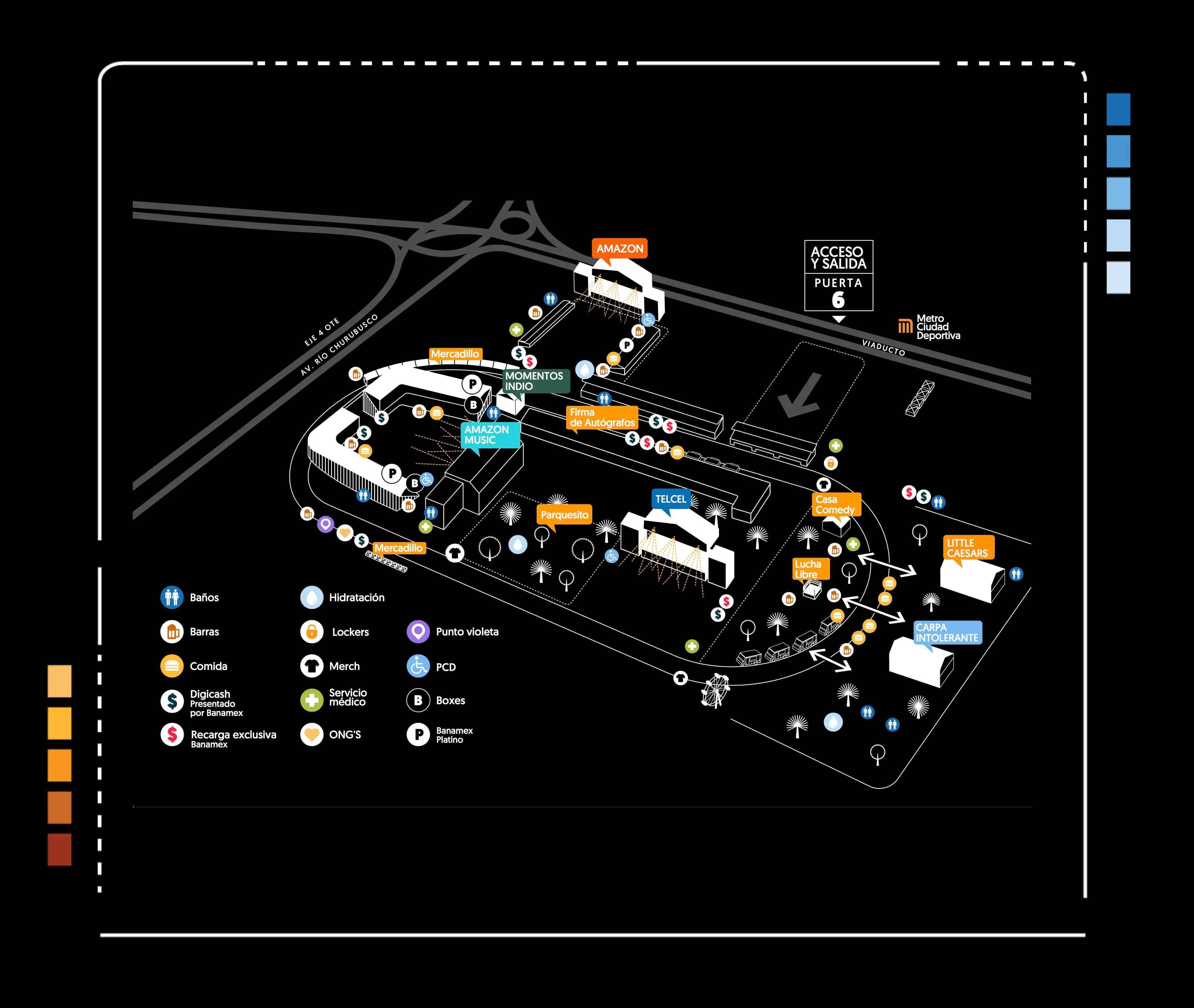 El Mapa considera 5 escenarios: Amazon Music, Amazon, Telcel, Little Caesars y Carpa Itinerante. Además, un área de Lucha Libre y la Casa Comedy.