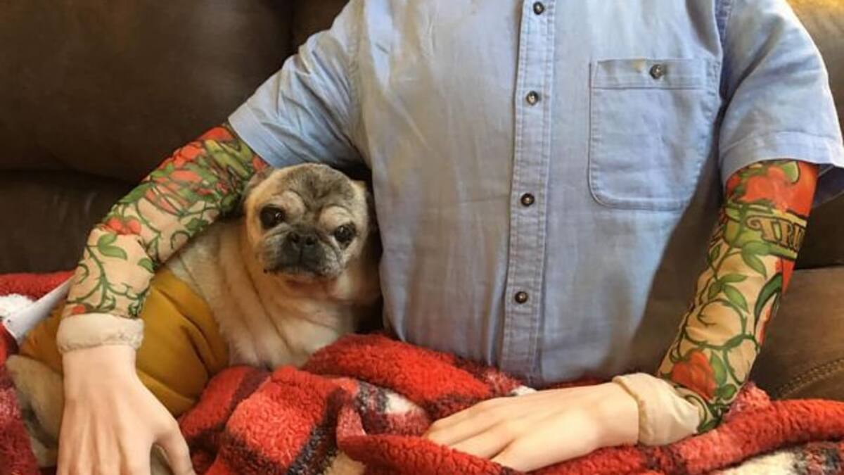 Un maniquí fue disfrazado del dueño de un perro de raza pug para que dejara de estar triste