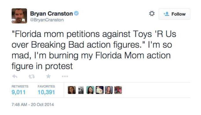 "La petición de la mamá de Florida contra las figuras de acción de Breaking Bad en Toys 'R' Us". Estoy muy enojado, voy a quemar mi figura de acción de la mamá de Florida en protesta.