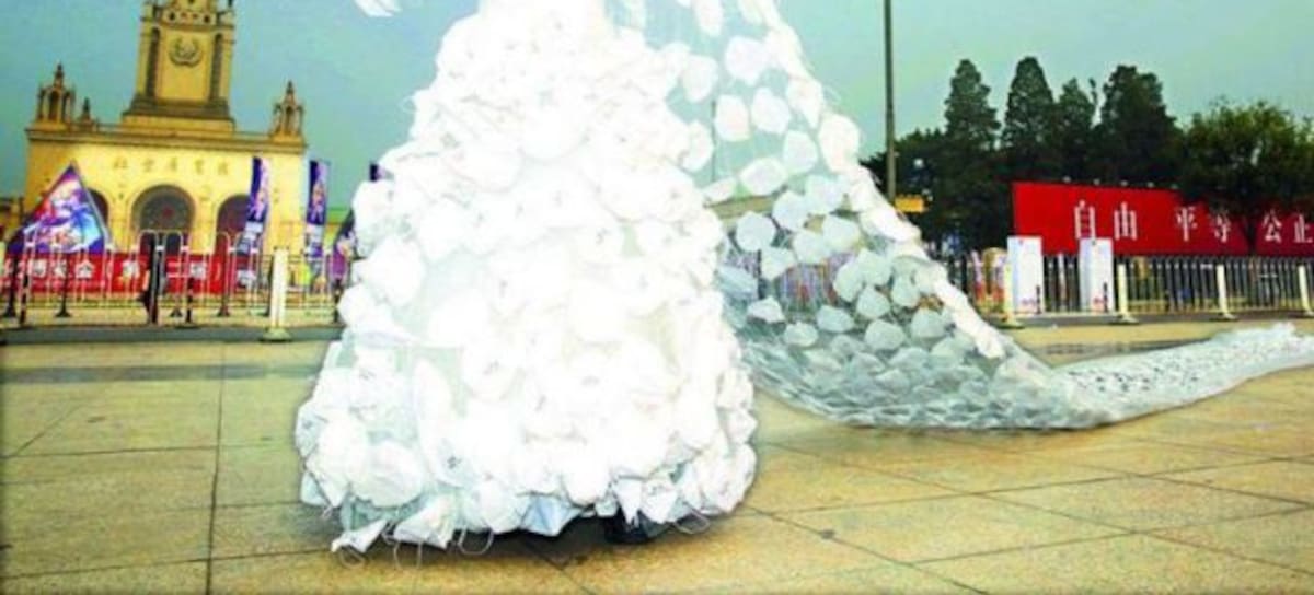 El artista chino Ning Kong nos presenta en esta ocasión su última creación, nada más y nada menos que un vestido de novia con una cola de 10 metros de largo, hecho de cientos de mascarillas.