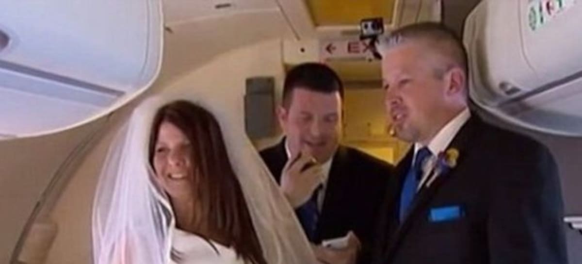 La pareja compró 30 billetes para familia y amigos para que se sentaran en los primeros puestos del avión y los recién casados leyeron sus votos desde la pantalla de sus teléfonos móviles.