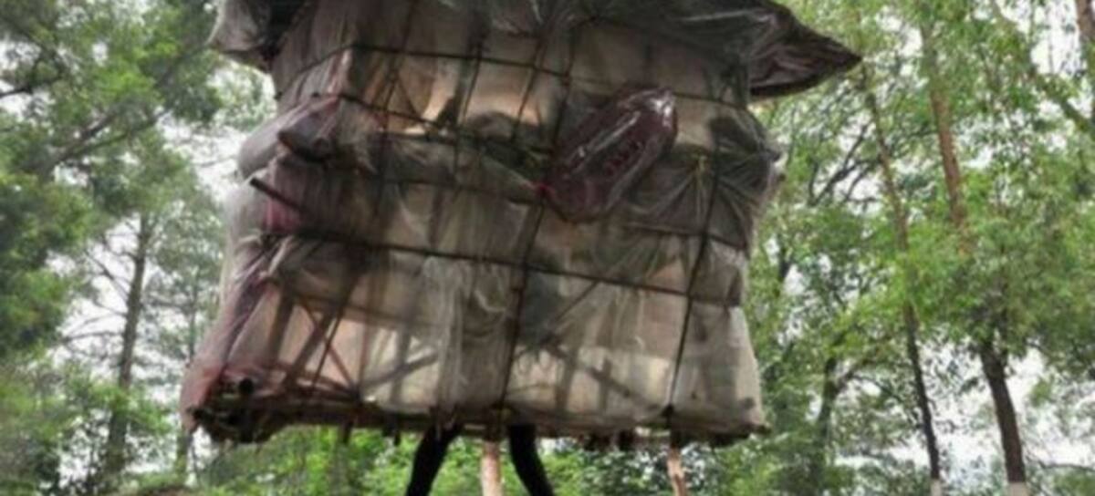 Liu Lingchao se ha ganado el apodo de 'hombre caracol' por llevar su casa a pie. El hombre, natural de china, lleva seis años viajando a pie y cargando a cuestas una casa fabricada con materiales desechables que él mismo recicla.