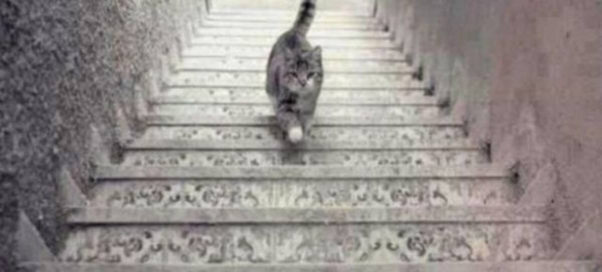 En la imagen puede verse a un gato en unas escaleras. La cuestión es: ¿sube o baja? El curioso efecto visual de la fotografía ha generado fuertes debates en Internet, ya que muchos usuarios de la red han intentado dar una respuesta, y es que hay quien dice que sube y quien dice que baja.