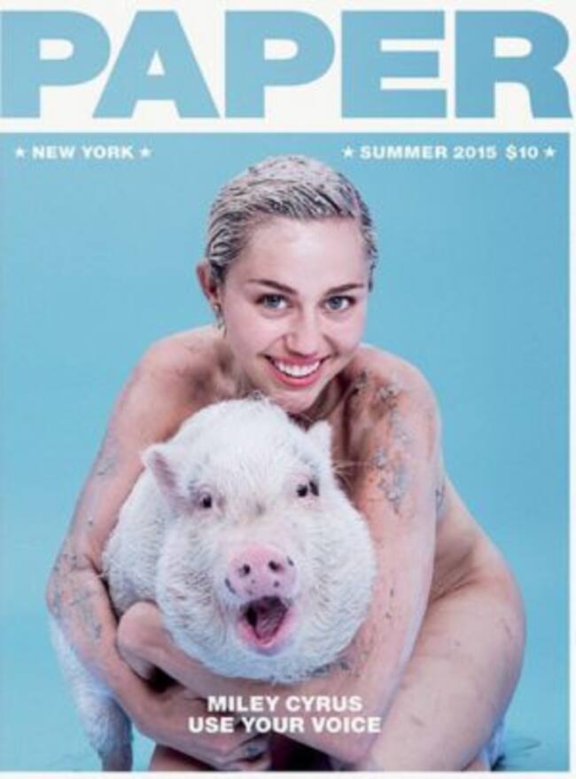 Cubierta de lodo y con una gran sonrisa, Miley Cyrus aparece desnuda junto a un cerdito en la portada de la edición de verano 2015 de la revista Paper.