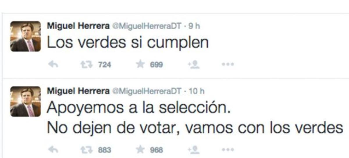 Luego de que este domingo, Miguel El piojo Herrera posteara en su cuenta de Twitter una serie de comentarios invitando a los mexicanos a “votar por los verdes”, haciendo alusión al Partido Verde Ecologista de México (PVEM) las reacciones de políticos y actores comenzaron a surgir en las redes sociales bajo la etiqueta #PiojoVendido.