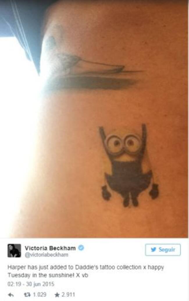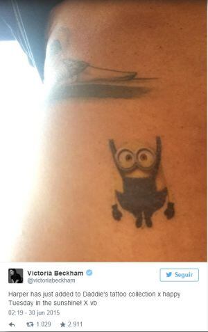 Victoria Beckham, dio cuenta de ello en su perfil de Twitter: “Harper acaba de añadir algo a la colección de tatuajes de su papá. Feliz martes al sol”.