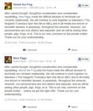 Así lo anunciaron ambos personajes de ficción en sus páginas oficiales de Facebook. “Después de una cuidadosa reflexión y considerables riñas, Miss Piggy hizo la difícil decisión de terminar nuestra relación amorosa”, se puede leer en una publicación en la página de la rana anteriormente conocida como René.