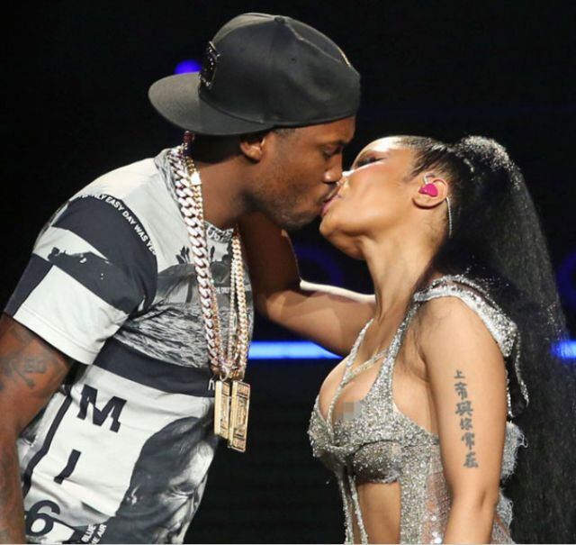 Ante el incidente continuó sin detener el show. Durante su concierto, se acercó su novio, Meek Mill para cantar su colaboración All Eyes on You, e incluso se dieron un apasionado beso sobre la tarima.