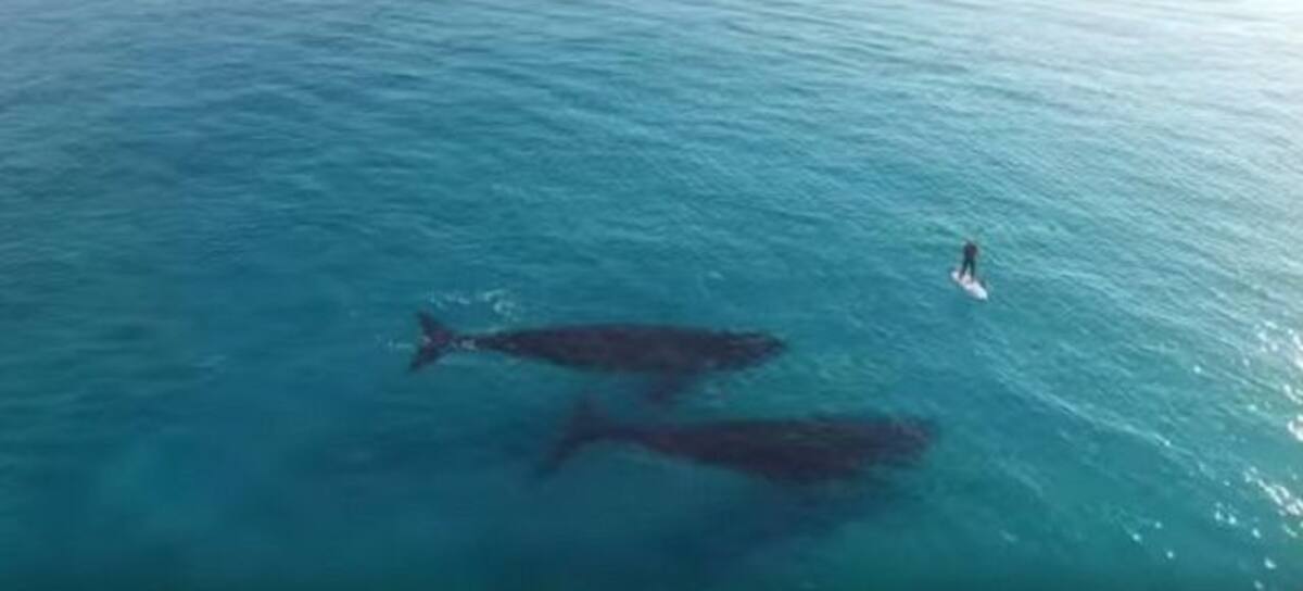 Una dron capturó impresionantes imágenes de dos enormes ballenas mientras nadaban junto a un hombre que practicaba paddleboarding.