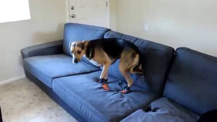 Este perrito modela sus calcetines nuevos