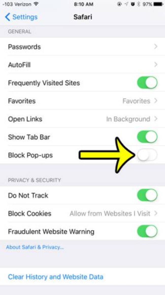 También puedes apgar esos molestos mensajes mejor conocidos como Pop-ups. Te vas a Configuración >> Safari y luego desactivas el botón de Pop-ups.