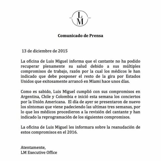 El comunicado dice que Luis Miguel presentó “de nuevo los síntomas que viene padeciendo las últimas tres semanas, por lo que los médicos procedieron a la revisión del cantante y han indicado la reprogramación de los siguientes compromisos”.